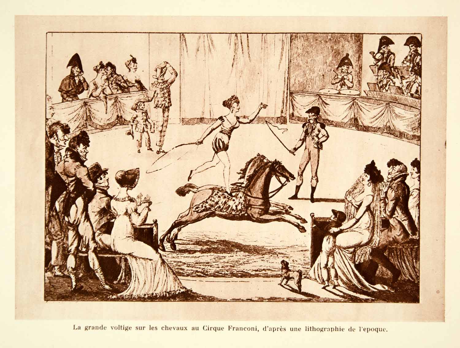 This is an original 1931 monochrome photolithograph of an etching (circa 1815?) of a bareback horse riding performance at the Cirque Franconi.