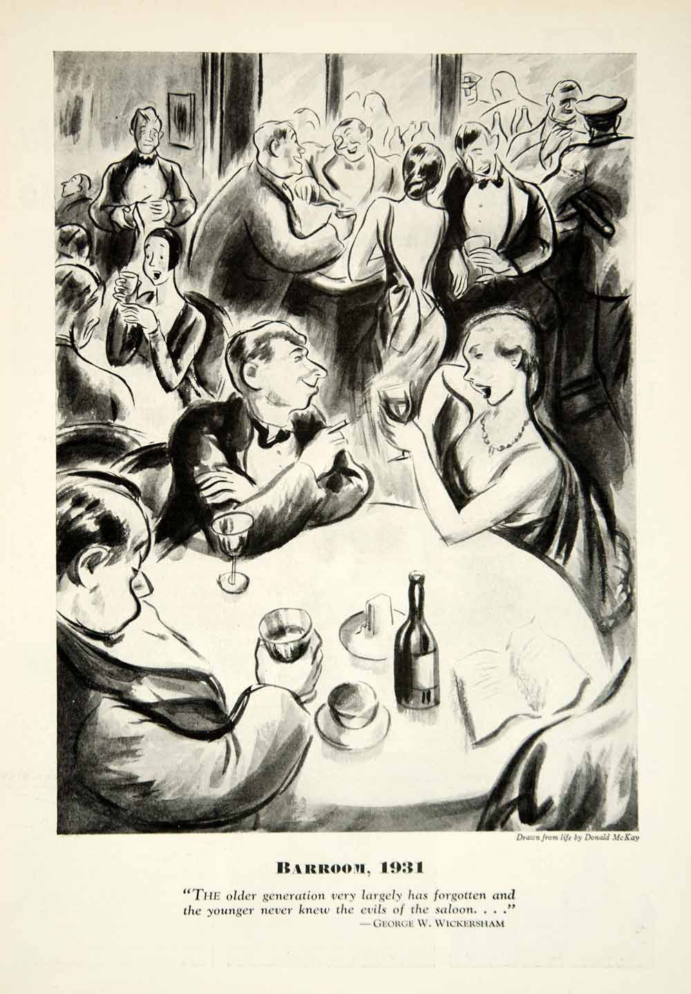 This is an original 1931 black and white halftone print of an Art Deco style drawing by Donald McKay that portrays men and women enjoying their drinks at restaurant and bar during the Great Depression era. The quote below the drawing is from George W. Wickersham and it reads; "The older generation very largely has forgotten and the younger never knew the evils of the saloon..."