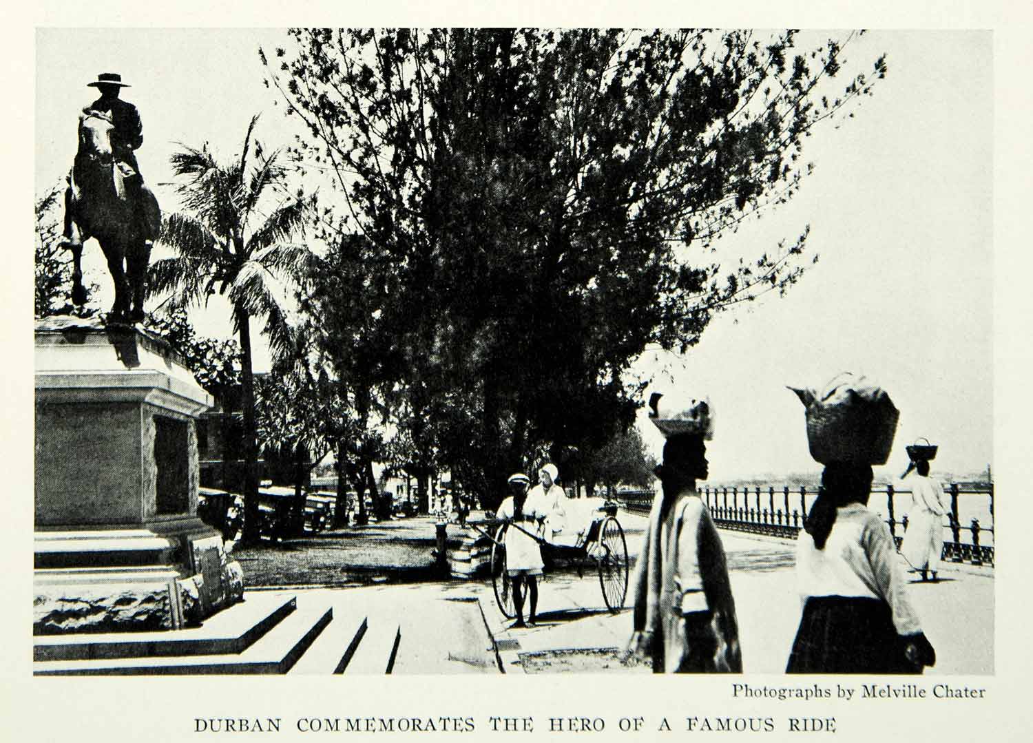 This is an original 1931 black and white halftone print of the statue of Dick King who rode 600 miles to Grahamstown in ten days to get relief for the British when the Dutch were besieging Durban. It stands on the Victoria Embankment at Durban in South Africa.