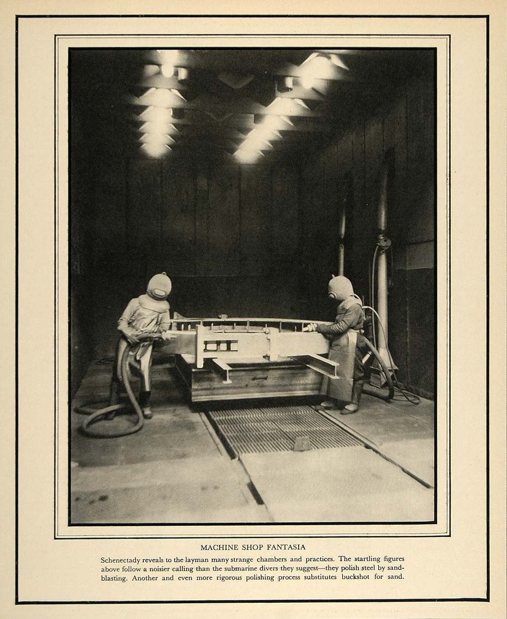 This is an original 1931 halftone print of workers on the General Electric assembly line in Schenectady polishing steel by sandblasting. (Please note that there is printing on the reverse.)