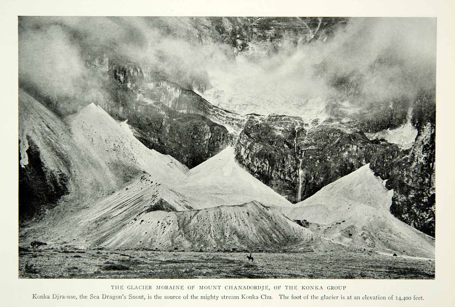 This is an original 1931 black and white halftone print of the glacier moraine of Mount Chanadordje of the Konka mountain chain in China.