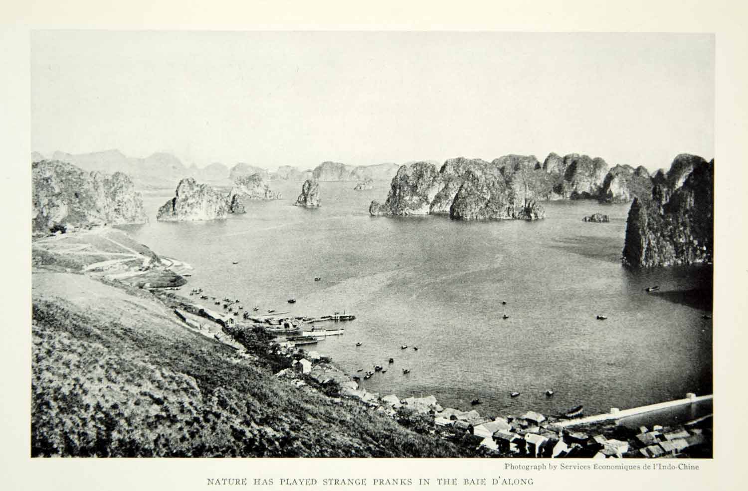 This is an original 1931 black and white halftone print of the Baie D'Along, with a view of the Vietnamese town of Hongay, or Ha Long.
