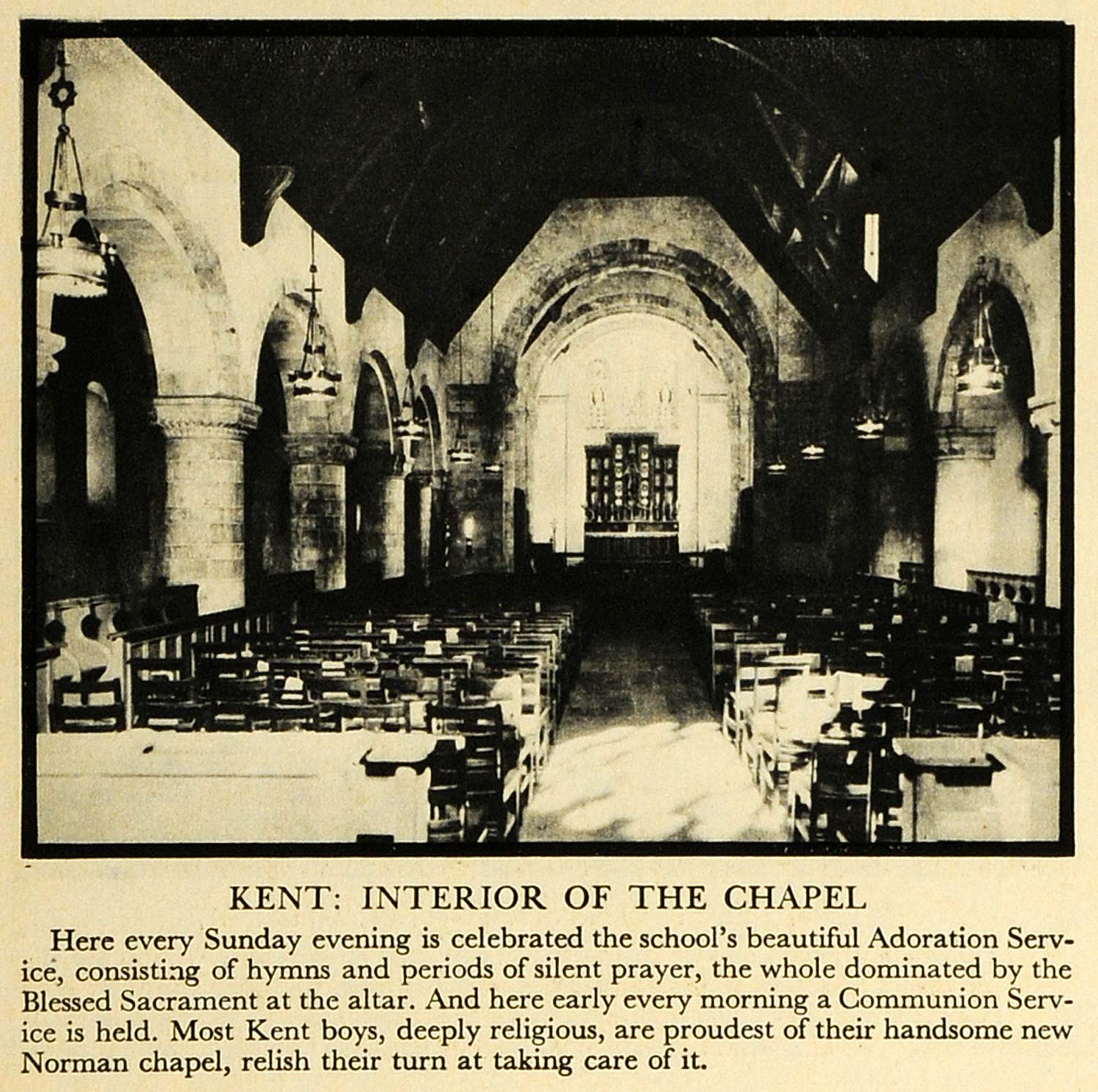 This is an original 1931 halftone print of the interior of the Norman chapel in Kent, Connecticut. The caption writes, "Here every Sunday evening is celebrated the school's beautiful Adoration Service, consisting of hymns and periods of silent prayer, the whole dominated by the Blessed Sacrament of the altar..."