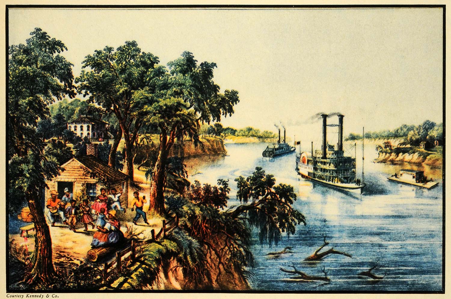 This is an original 1931 color print of the steamship the Robert E. Lee. This image is titled, "Low Water." The steamship was nicknamed the "Monarch of the MIssissippi," was was built in New Albany, Indiana in 1866. She was named after the commander of the Confederate Army of Northern Virginia during the American Civil War.