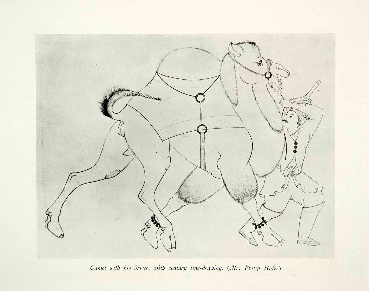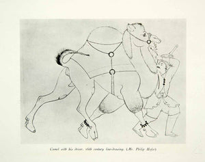 This is an original 1931 black and white halftone print of a Persian line drawing from the 16th century that depicts a camel and his driver.