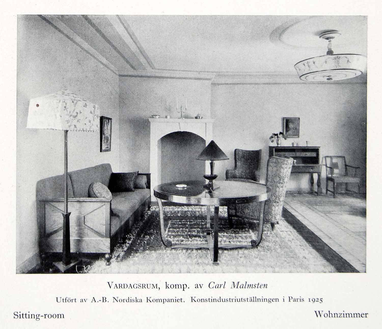 This is an original 1931 black and white halftone print of a sitting room in a house in Stockholm, Sweden.