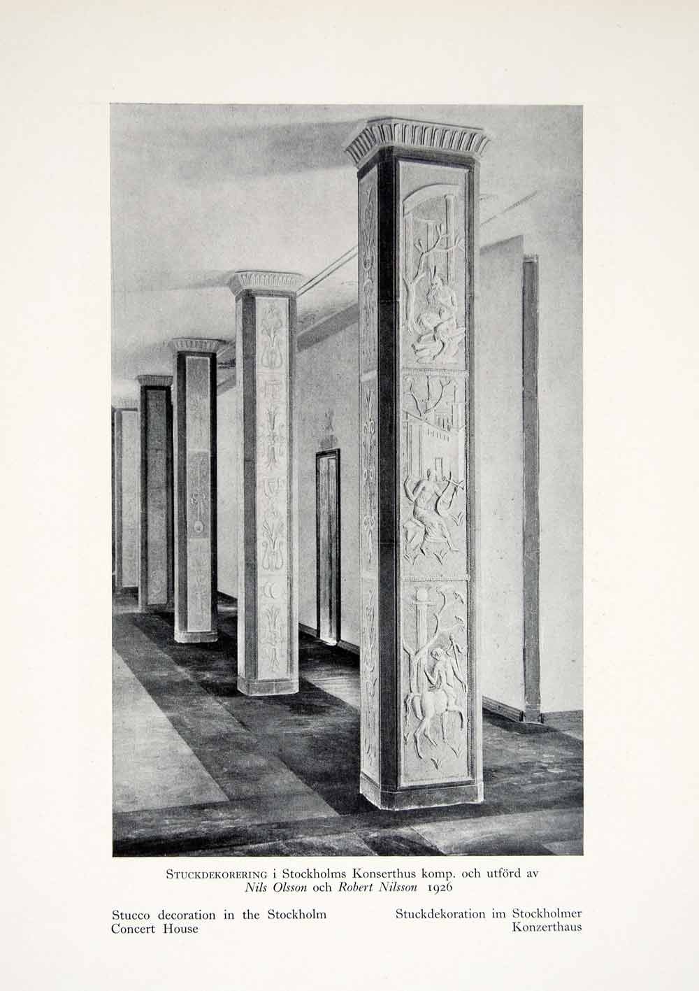 This is an original 1931 black and white halftone print of stucco decoration in the Stockholm Concert House in Sweden.