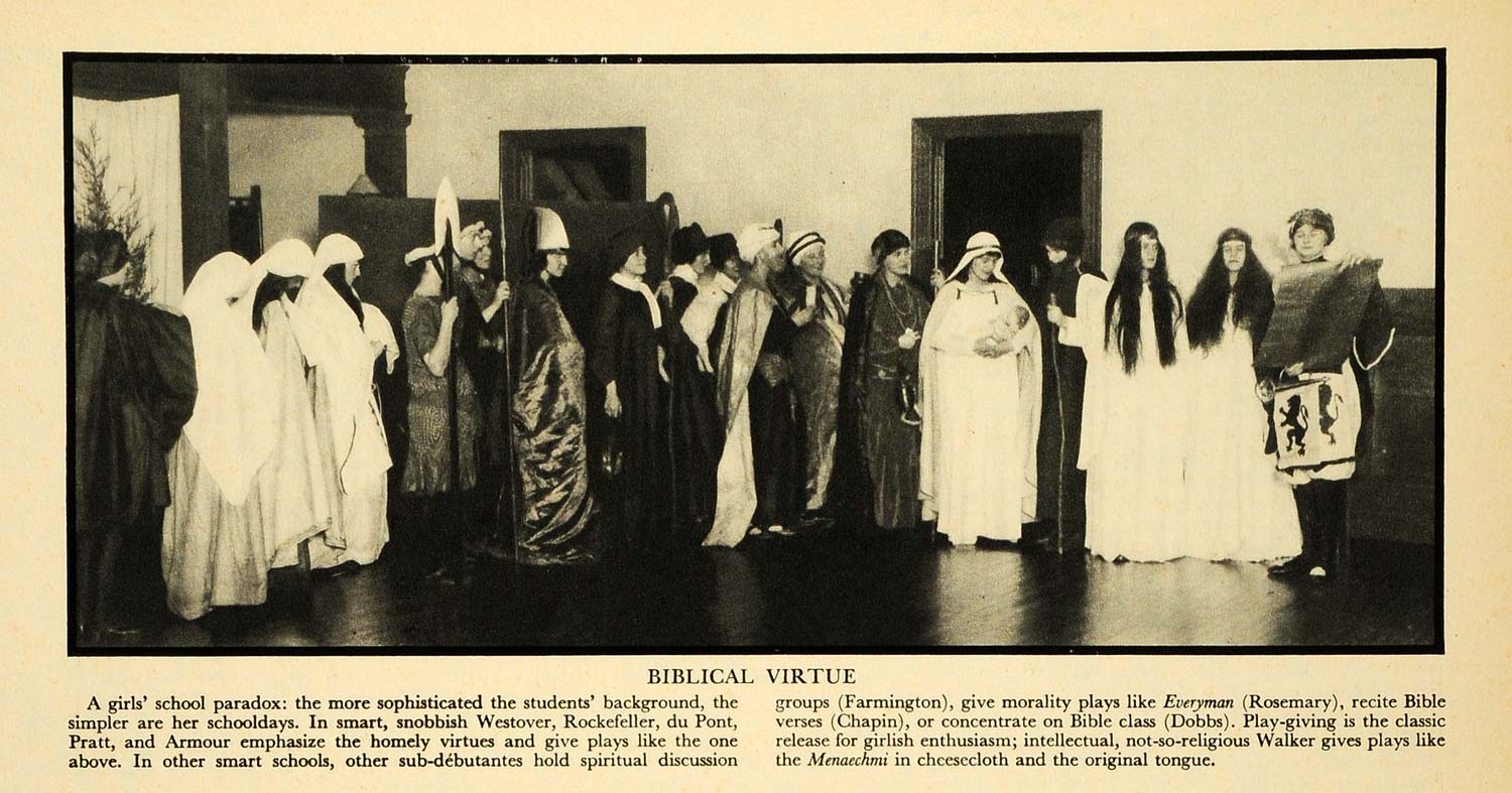 This is an original 1931 halftone print of a girls' school giving a play. The caption writes, "In smart, snobbish Westover, Rockefeller, du Pont, Pratt, and Armour emphasize the homely virtues and give plays like the one above. In other smart schools, other sub-debutantes hold spiritual discussion groups, give morality plays like