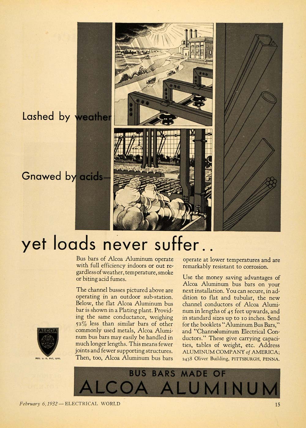 This is an original 1932 color print ad for the Bus Bars of Alcoa Aluminum from Aluminum Company of America located at 2438 Oliver Building, Pittsburgh, Pennsylvania.