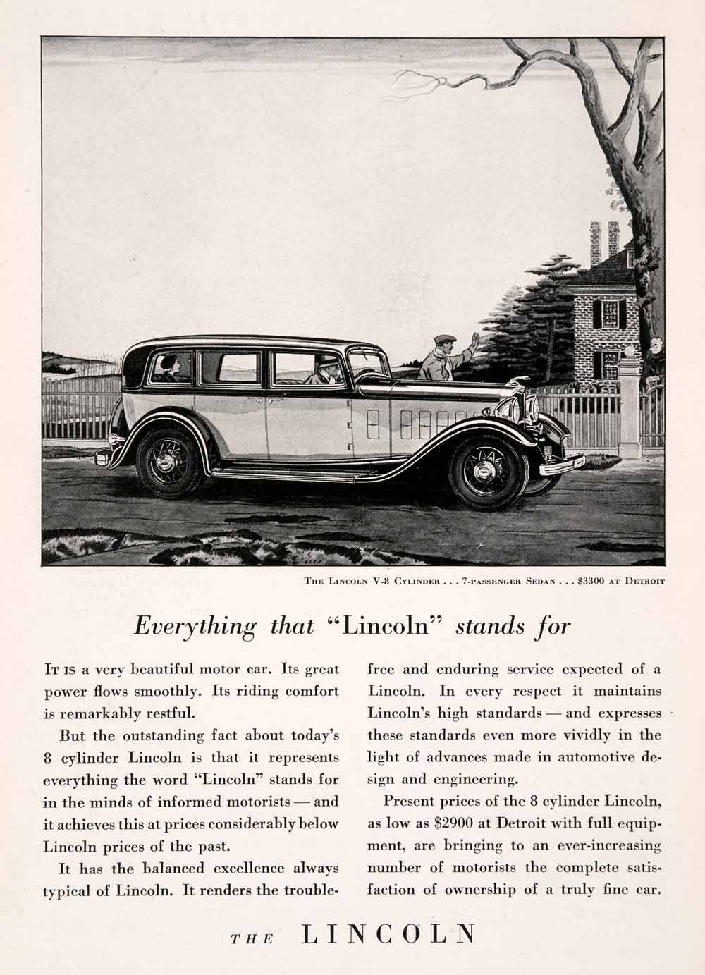 This is an original 1932 black and white print ad for Lincoln's line of V8 automobiles. This particular ad features the V8 Lincoln seven-passenger sedan.
