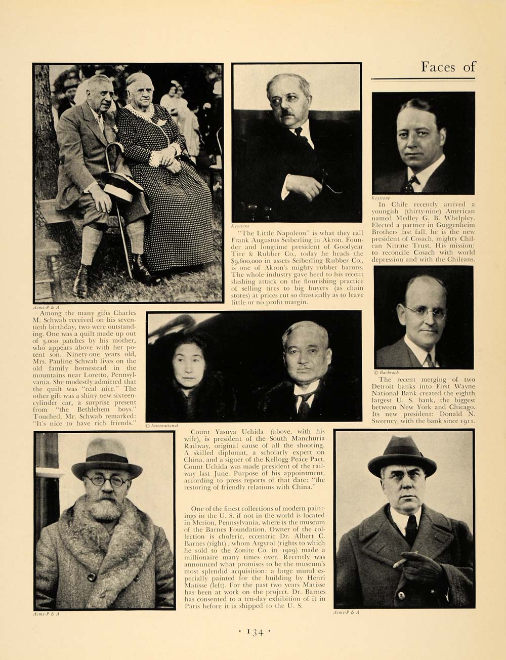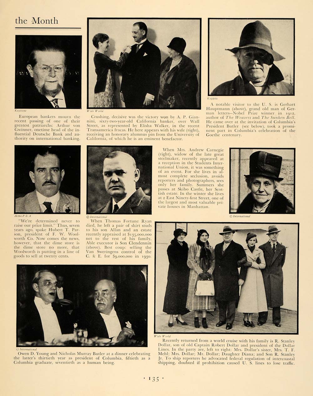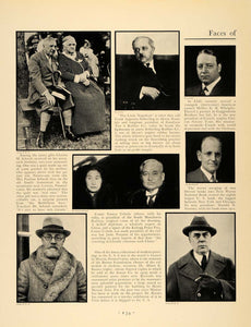 This is an original 1932 black and white print ad of the Faces of the Month. The ad features the images of Elisha Walker, Gerhart Hauptmann, Mrs. Andrew Carnegie, Son Clendennin, Captain Dollar, Owen Young, and Nicholas Butler, among others.