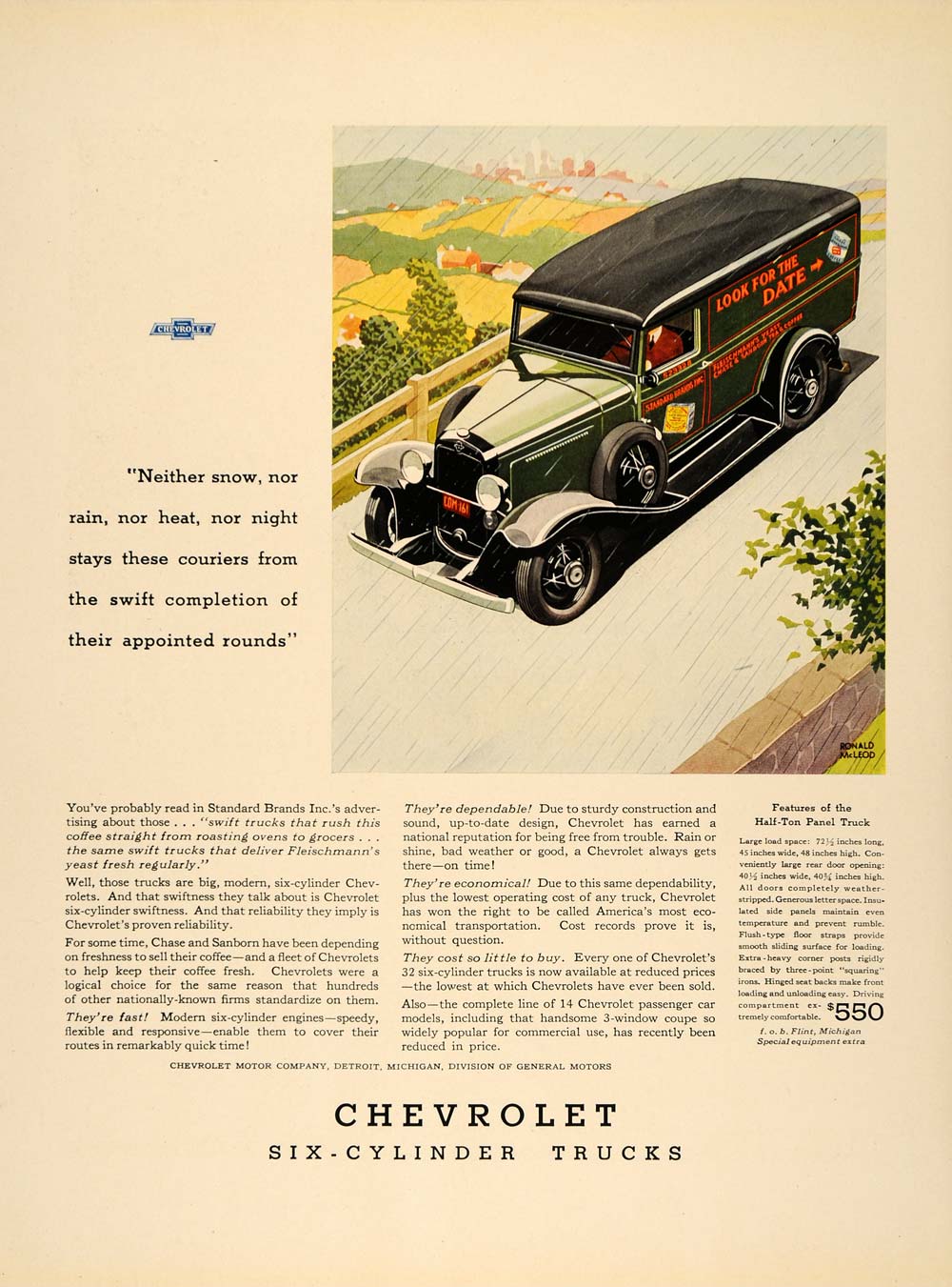 This is an original 1932 color print ad for the Chevrolet Motor Company of Detroit, Michigan. The ad features an image by Ronald McLeod of a half-ton panel truck.