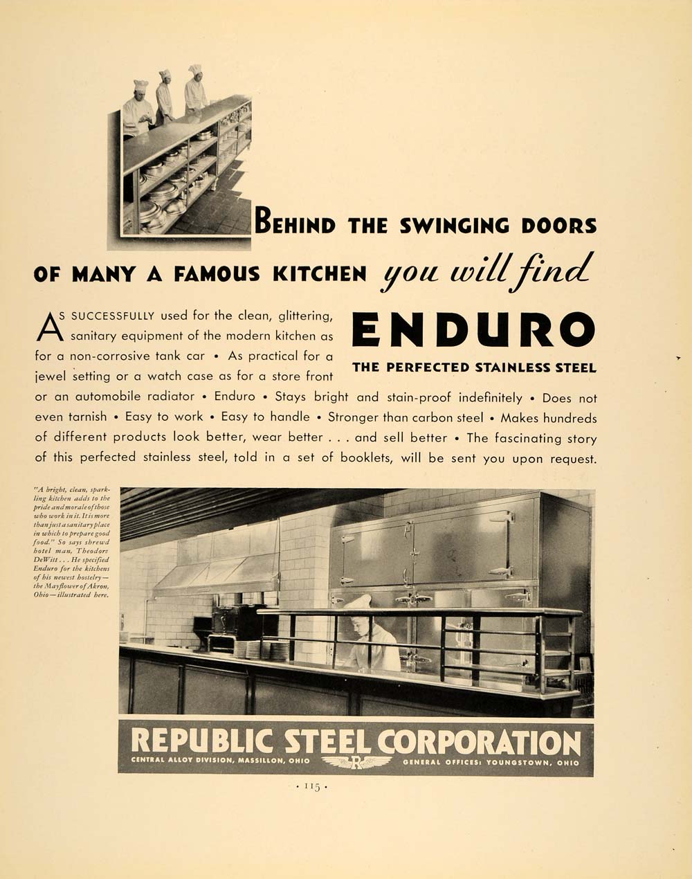 This is an original 1932 black and white print ad for Enduro Stainless Steel Kitchen Ware from the Republic Steel Corp. located in Youngstown, Ohio. Not only is stainless steel kitchen ware used at home, it is also at your favorite restaurant.