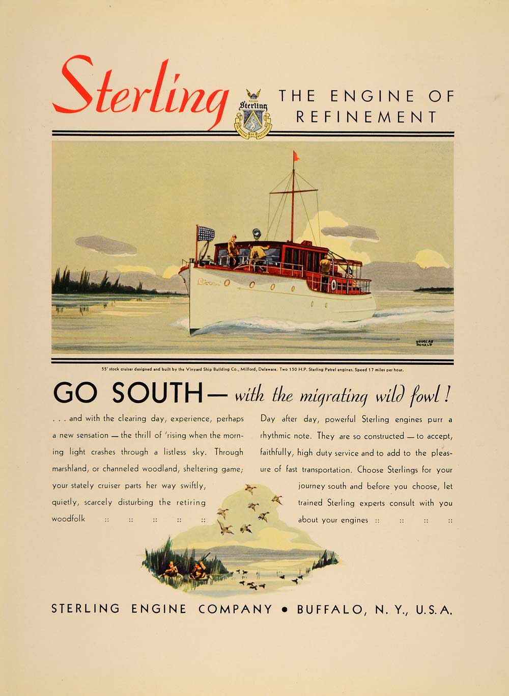This is an original 1932 color print ad for Ship Engines from the Sterling Engine Co. located in Buffalo, New York. The interesting illustration by Douglas Donald shows a ship set for the water. You ship will be set too with the use of Sterling engines.