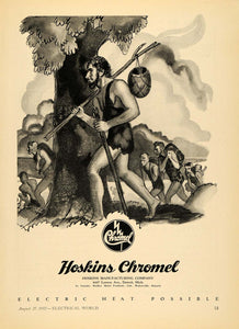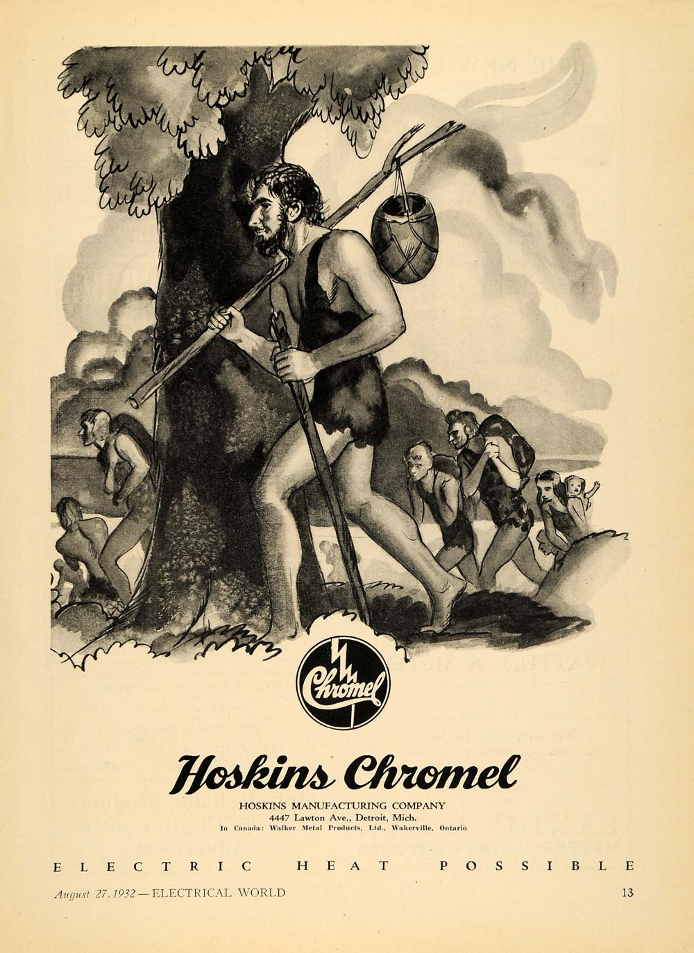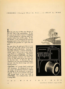 This is an original 1932 black and white two-page print ad for the Chromel heating-element wires from Hoskins Manufacturing Company located at 4447 Lawton Avenue, Detroit, Michigan.