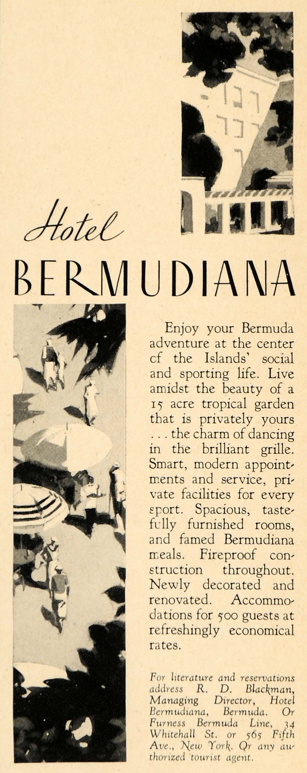 This is an original 1932 black and white print ad for the Hotel Bermudiana from Furness Bermuda Line located at 565 Fifth Avenue, New York.