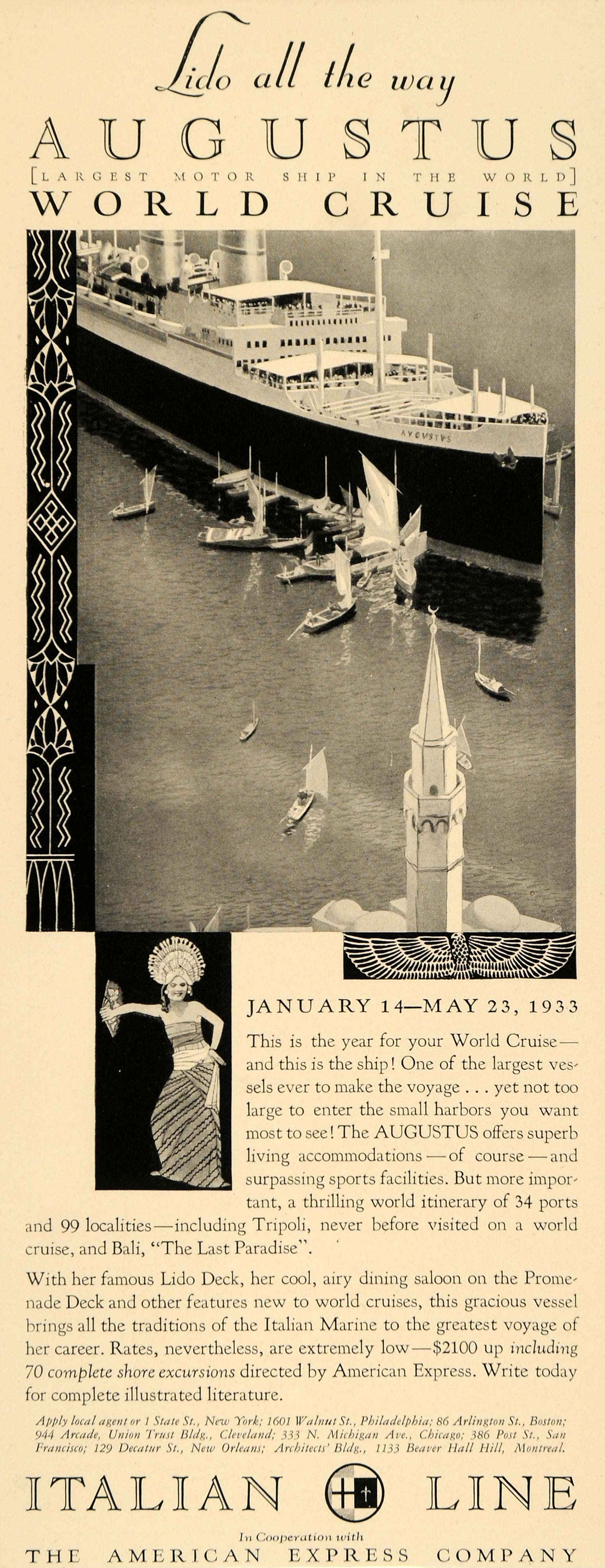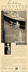 This is an original 1932 black and white print ad for the Italian Line promoting the Augustus world cruise ship.