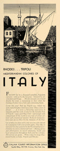 Keywords specific to this image: Rhodes, Tripoli, Mediterranean colonies, touristic attractions, boat, travel Vintage Advertising