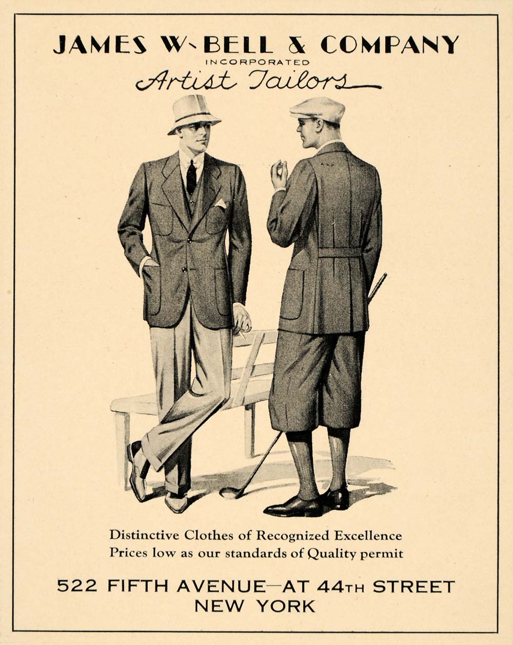 This is an original 1932 black and white print ad promoting gentleman's clothing from James W-Bell & Company located at 522 Fifth Avenue and 44th Street, New York.