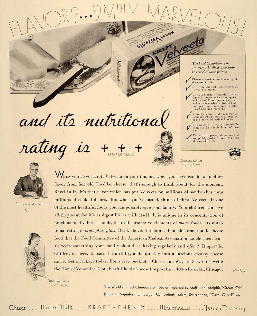 This is an original 1932 black and white print ad for Velveeta Cheese from Kraft Foods located in Chicago, Illinois.