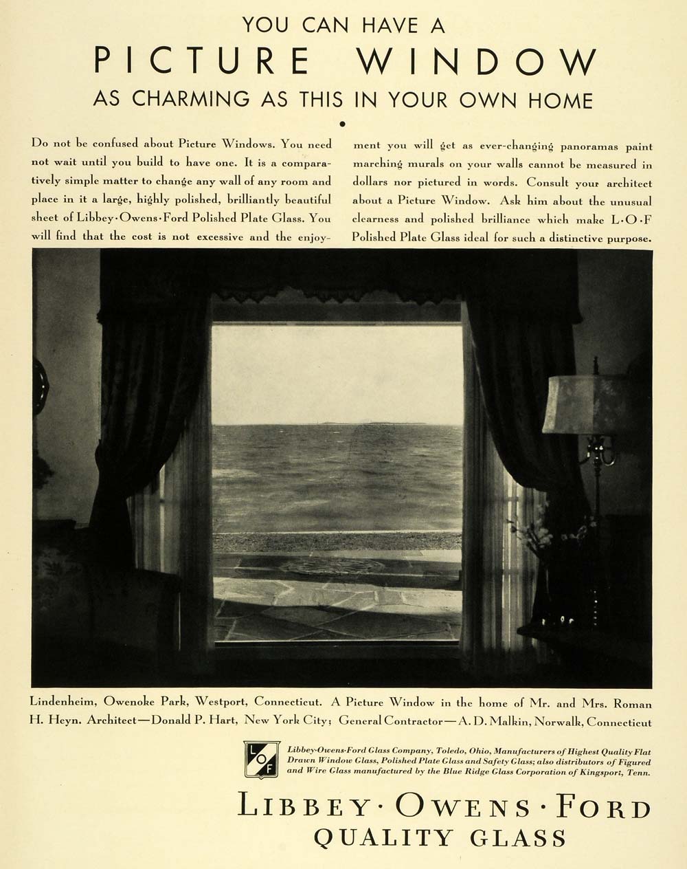 This is an original 1932 black and white print ad for the L-O-F Polished Plate Glass from Libbey-Owens-Ford Glass Company located in Toledo, Ohio. This item features an image of a picture window in the home of Mr. and Mrs. Roman H. Heyn. Architect: Donald P. Hart of New York City. General Contractor: A. D. Malkin of Norwalk, Connecticut.