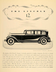 This is an original 1932 black and white print ad promoting the Lincoln Sedan V-12 automobile. This is an excellent original print item for the collector of this vintage car.