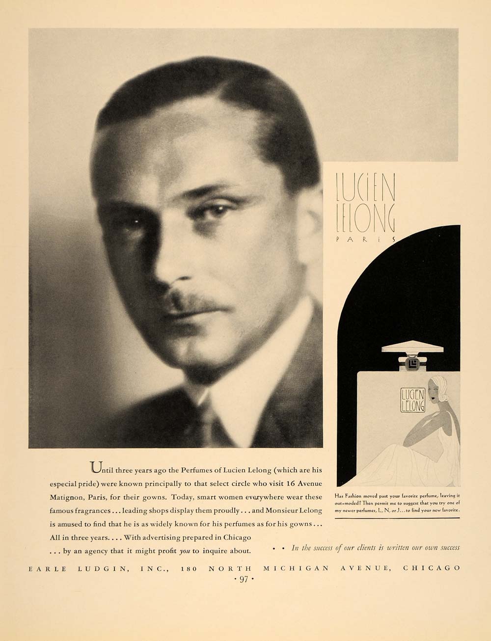 This is an original 1932 black and white print ad for Lucien Lelong Perfumes from the Earle Ludgin Inc. located at 180 North Michigan Avenue, Chicago, Illinois. Having first been a couturier, he progressed to create perfumes which he also sold at his gown stores in Paris.