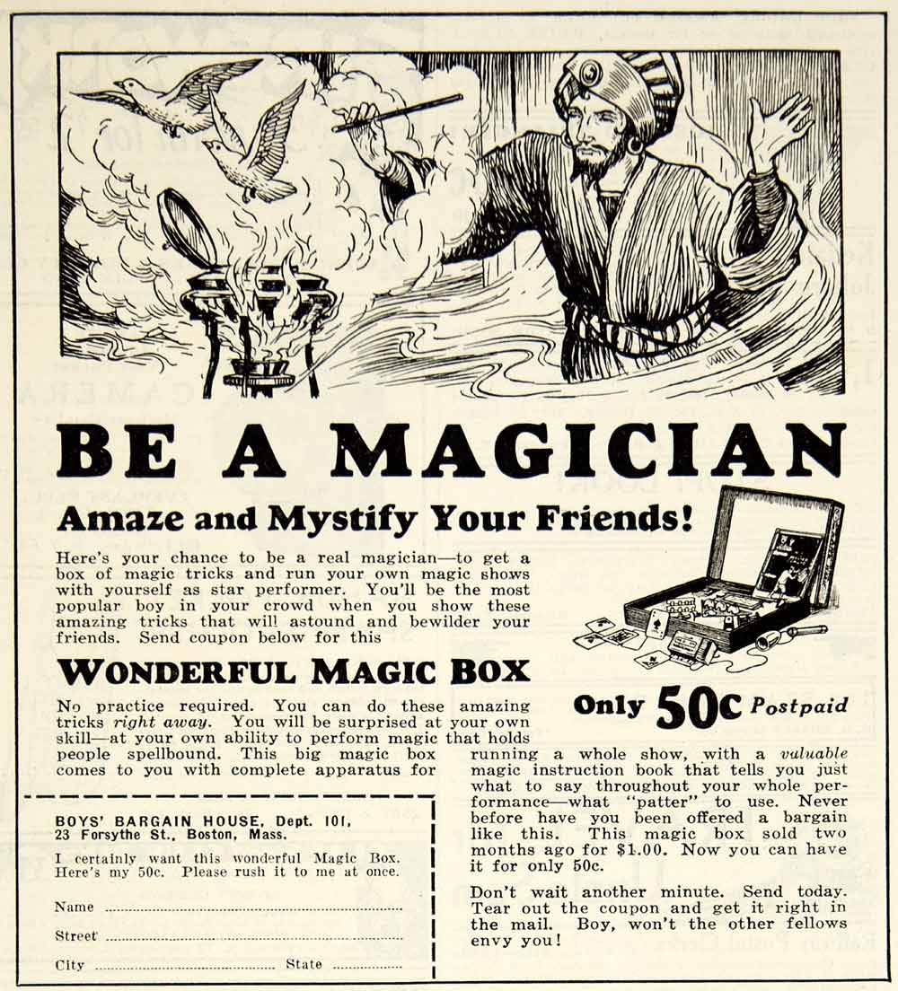 This is an original 1932 black and white print ad for the Wonderful Magic Box from the Boys' Bargain House at 23 Forsythe Street, Boston.