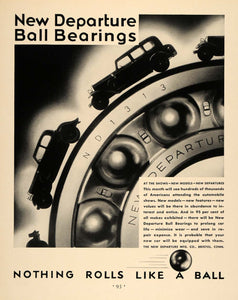 This is an original 1932 black and white print ad for New Departure Ball Bearings.