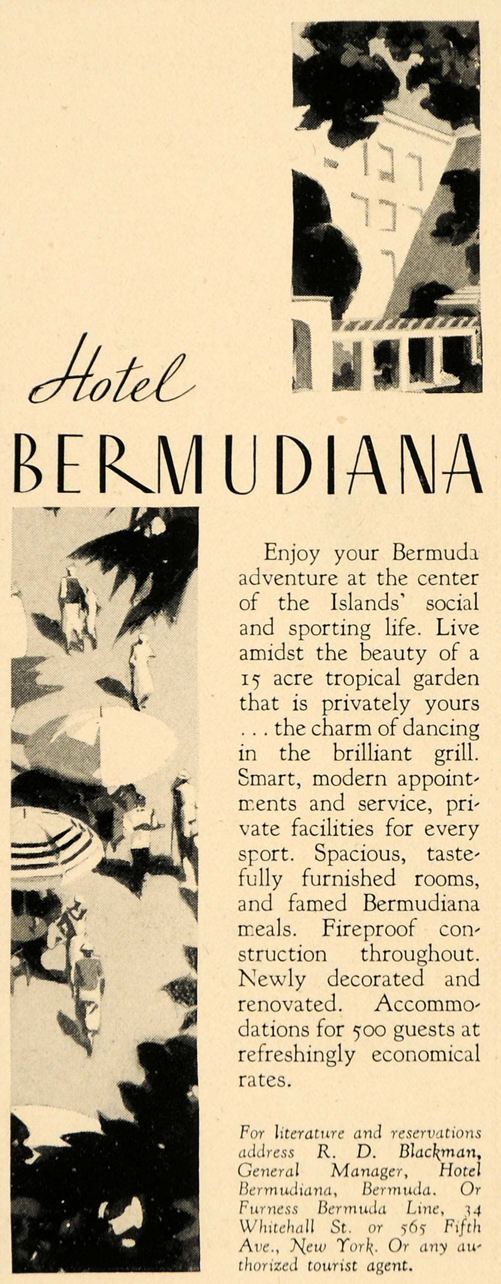 This is an original 1932 black and white print ad for the Hotel Bermudiana from Furness Bermuda Line located at 565 Fifth Avenue, New York.