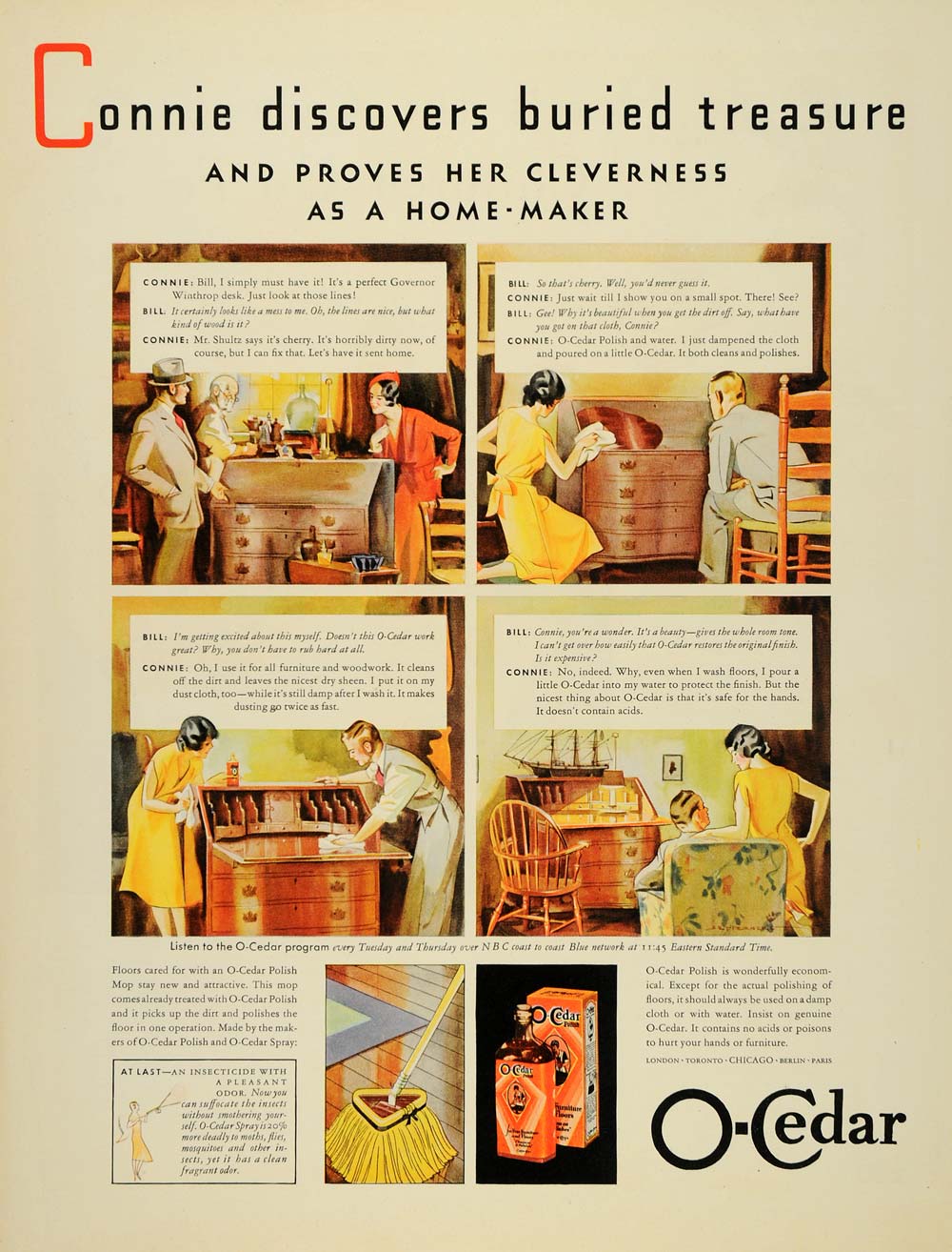 This is an original 1932 color print ad for O-Cedar Polish and Spray, located in Chicago, London, Toronto, Berlin and Paris.