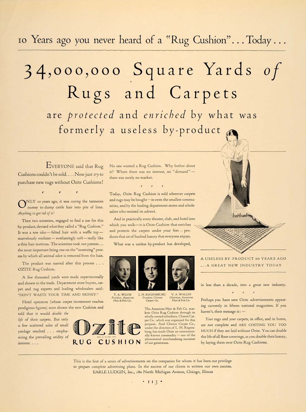 This is an original 1932 black and white print ad for the Ozite Rug Cushion from The American Hair and Felt Company.