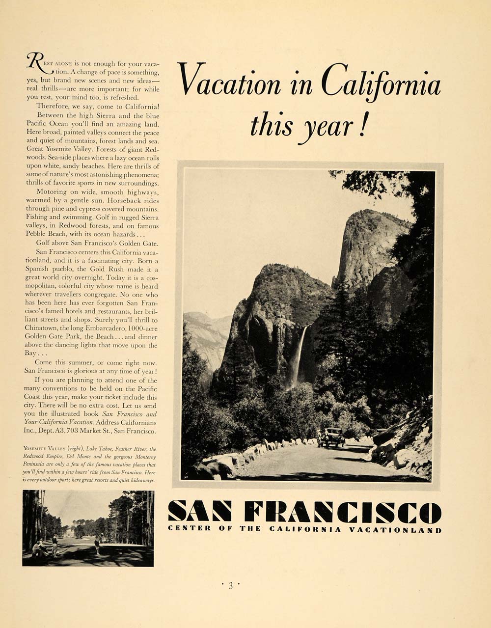 This is an original 1932 black and white print ad for San Francisco, California tourism. The ad features an image of Yosemite Valley.