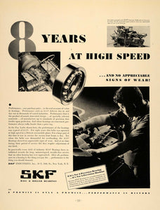 This is an original 1932 black and white print ad for SKF Ball and Roller Bearings.