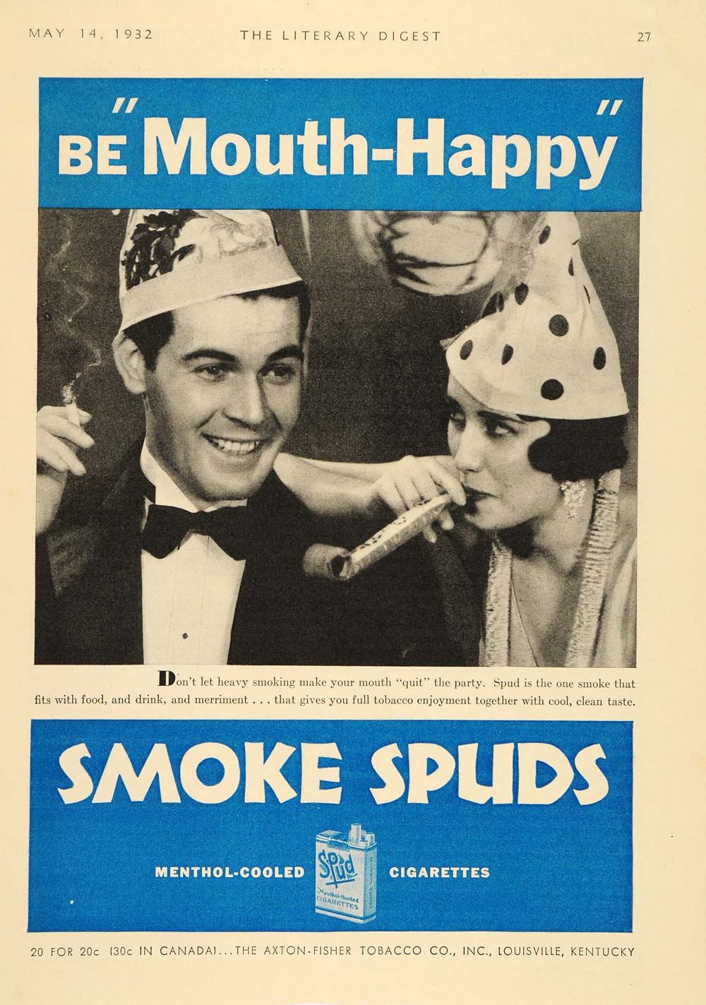 This is an original 1932 two-color print ad for Menthol-Cooled Spud Cigarettes.