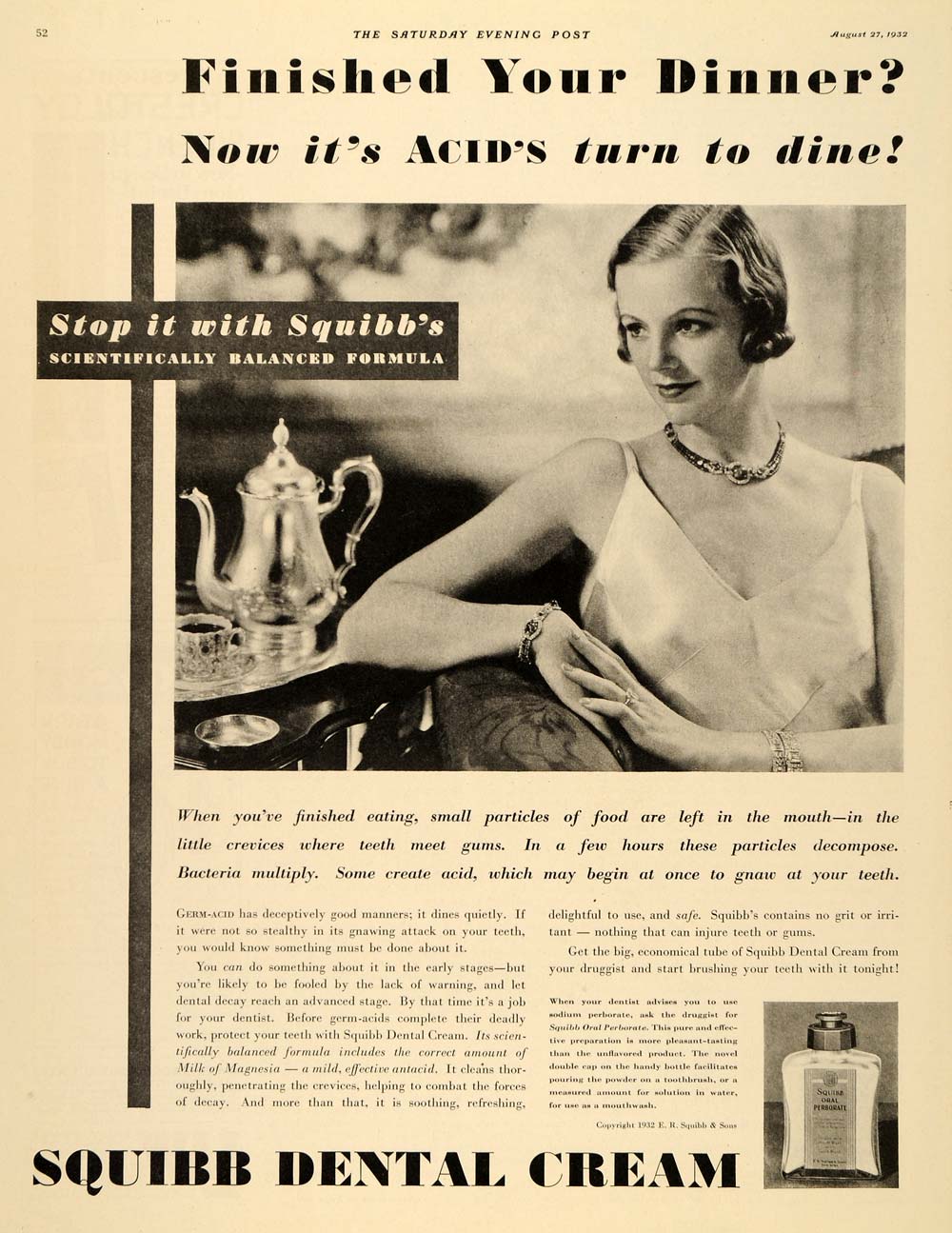 This is an original 1932 black and white print ad for Squibb Dental Cream by E. R. Squibb & Sons located in New York.