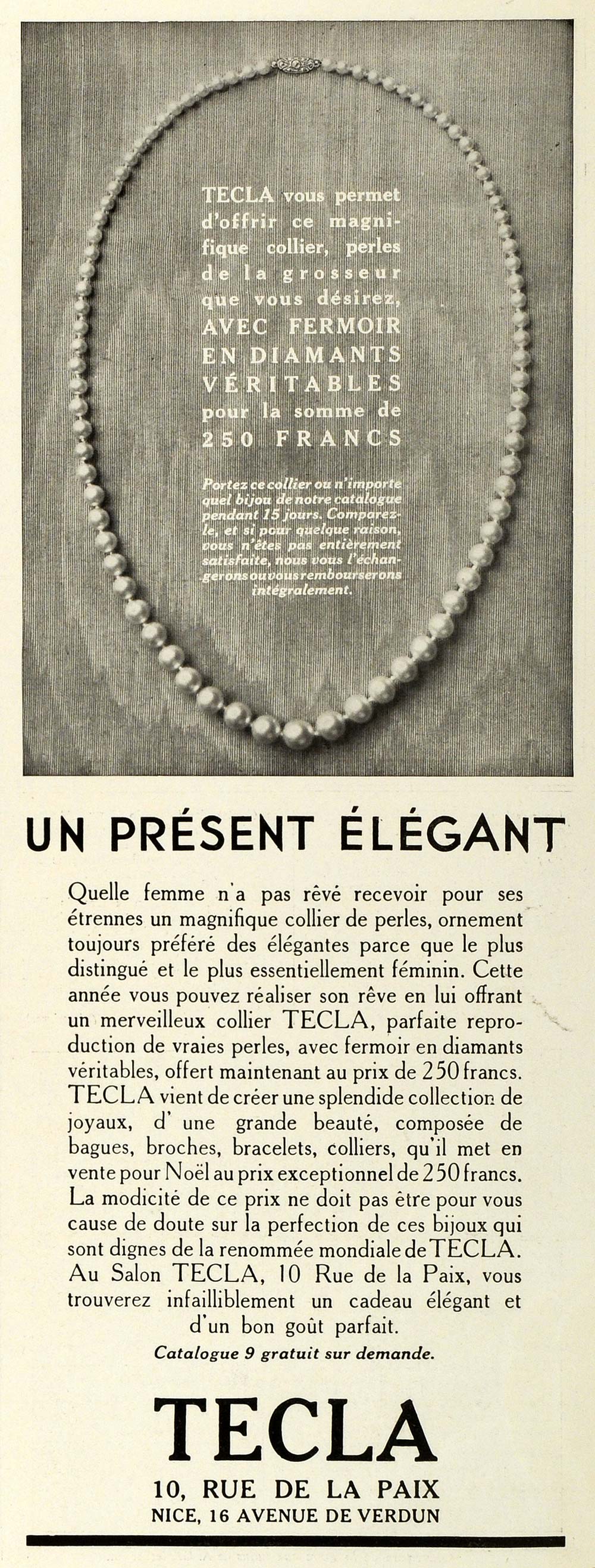 This is an original 1932 black and white French print ad for Tecla jewelers of 10 Rue De La Paix in Paris, as well as 16 Avenue De Verdun in Nice, France.