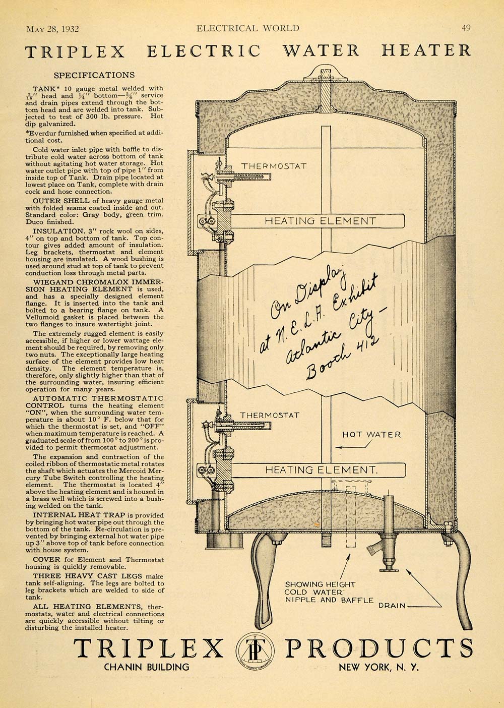 This is an original 1932 black and white print ad for the Triplex Electric Water Heater from Triplex Products located in New York.