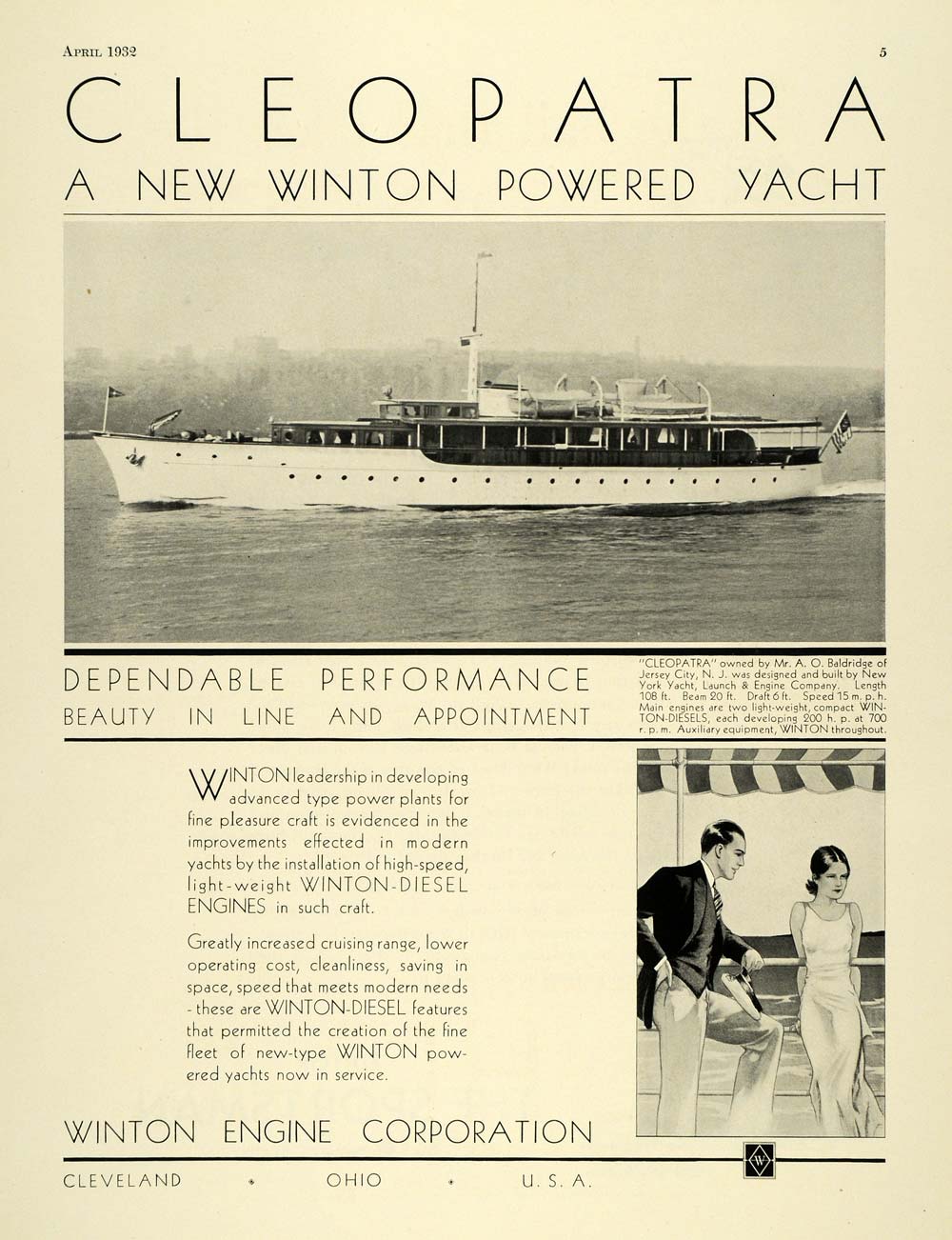 Cleopatra Winton engine-powered yacht, owned by Mr. A. O. Baldridge of Jersey City, New Jersey (designed and built by the New York Yacht, Launch, & Engine Company).