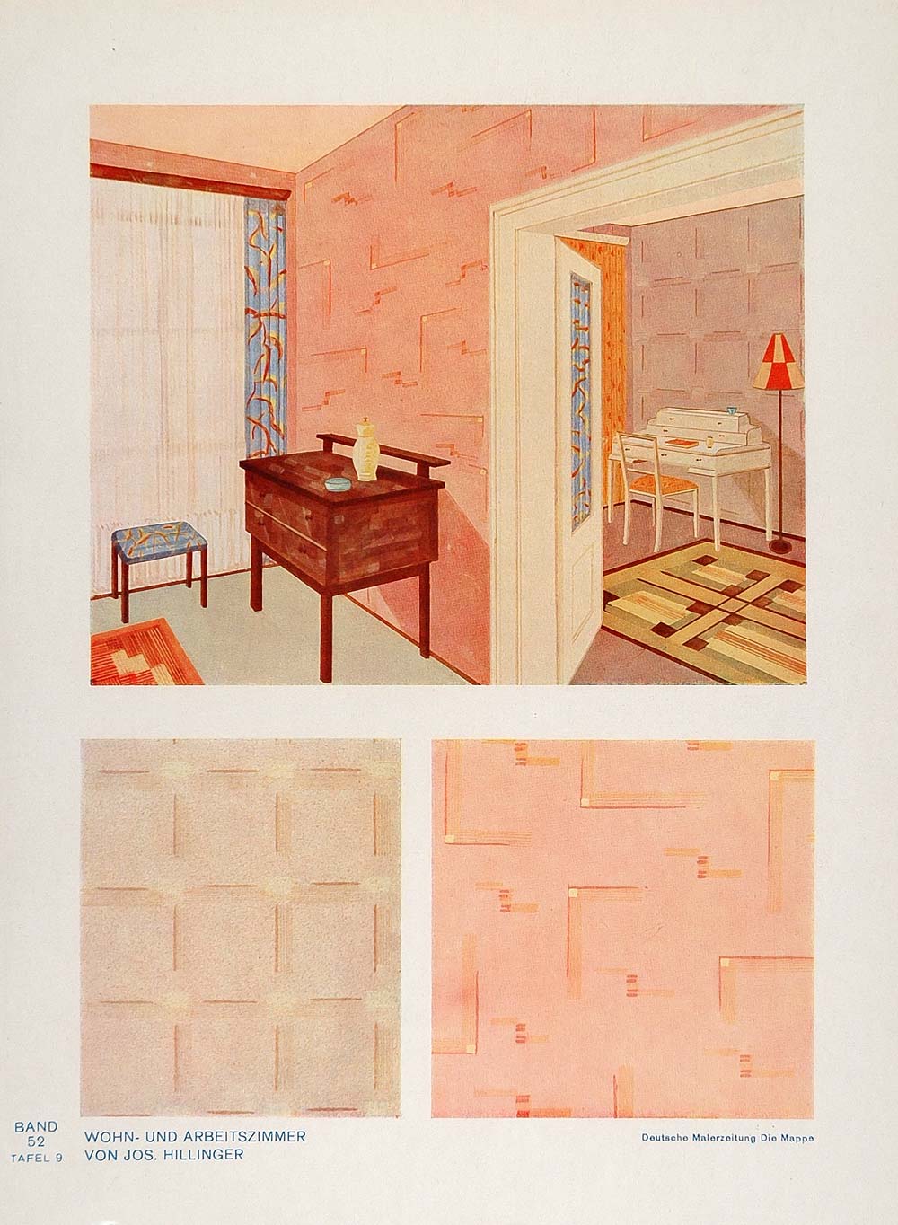This is an original 1932 color print of a living room and workroom, designed by Jos. Hillinger, with an Art Deco desk and chair, lamp, side table, stool, and Art Deco window and wallpaper treatments.