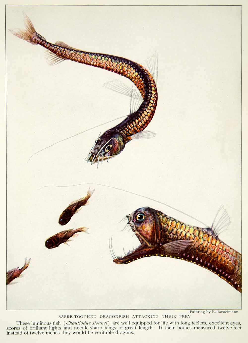 This is an original 1932 color print of Chauliodus Sloanei, commonly known as Dragonfish, about to enjoy a fishy meal.