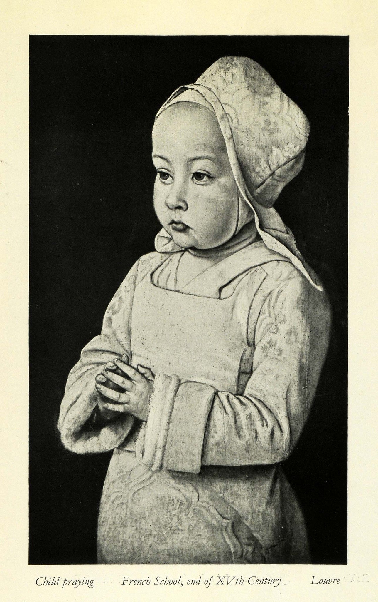 This is an original 1932 halftone print of a painting of a child praying, from the French School of art at the end of the 15th century.