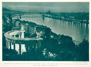 This is an original 1932 duotone halftone print of the cityscape of Budapest, Hungary, at night, with a view of the Parliament house, as seen from St. Gellért Hill.