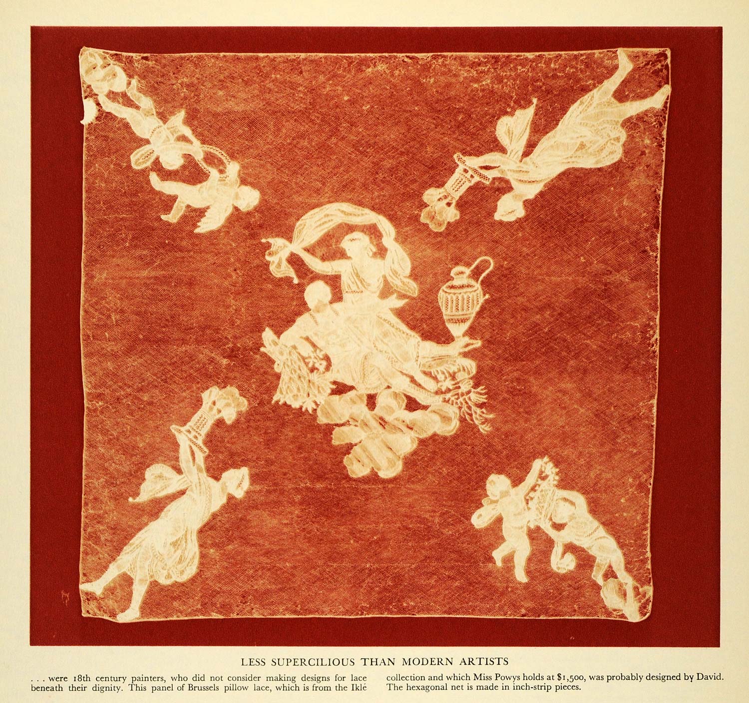 This is an original 1932 color print of a Brussels pillow lace from the Ikle collection. The caption writes, "Less supercilious than modern artists were 18th century painters, who did not consider making designs for lace beneath their dignity."