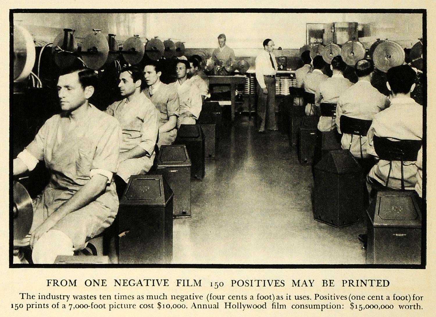 This is an original 1932 halftone print of men printing positives from negative film in Hollywood, Los Angeles, California. The caption writes, "The industry wastes ten times as much negative (four cents a foot) as it uses. Positives (one cent a food) for 150 prints of a 7,000 foot picture cost $10,000. Annual Hollywood film consumption: $15,000,000 worth."