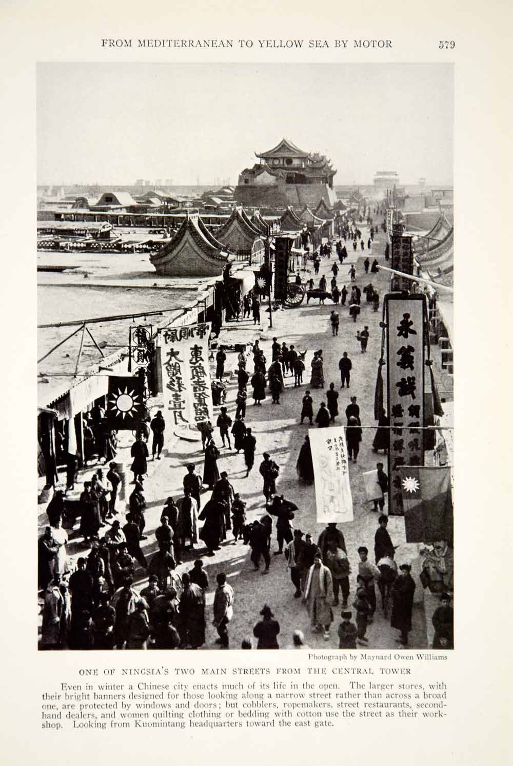 This is an original 1932 black and white halftone print of a main street and cityscape of Ningsia, China.