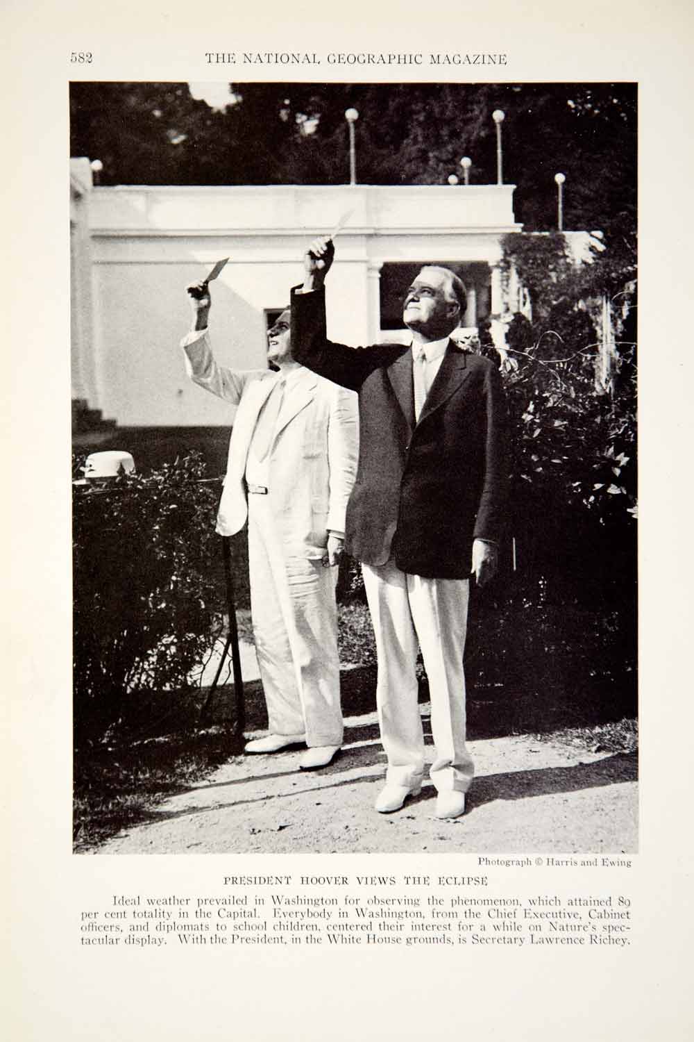 This is an original 1932 black and white halftone print of President Hoover viewing an eclipse at the White House.