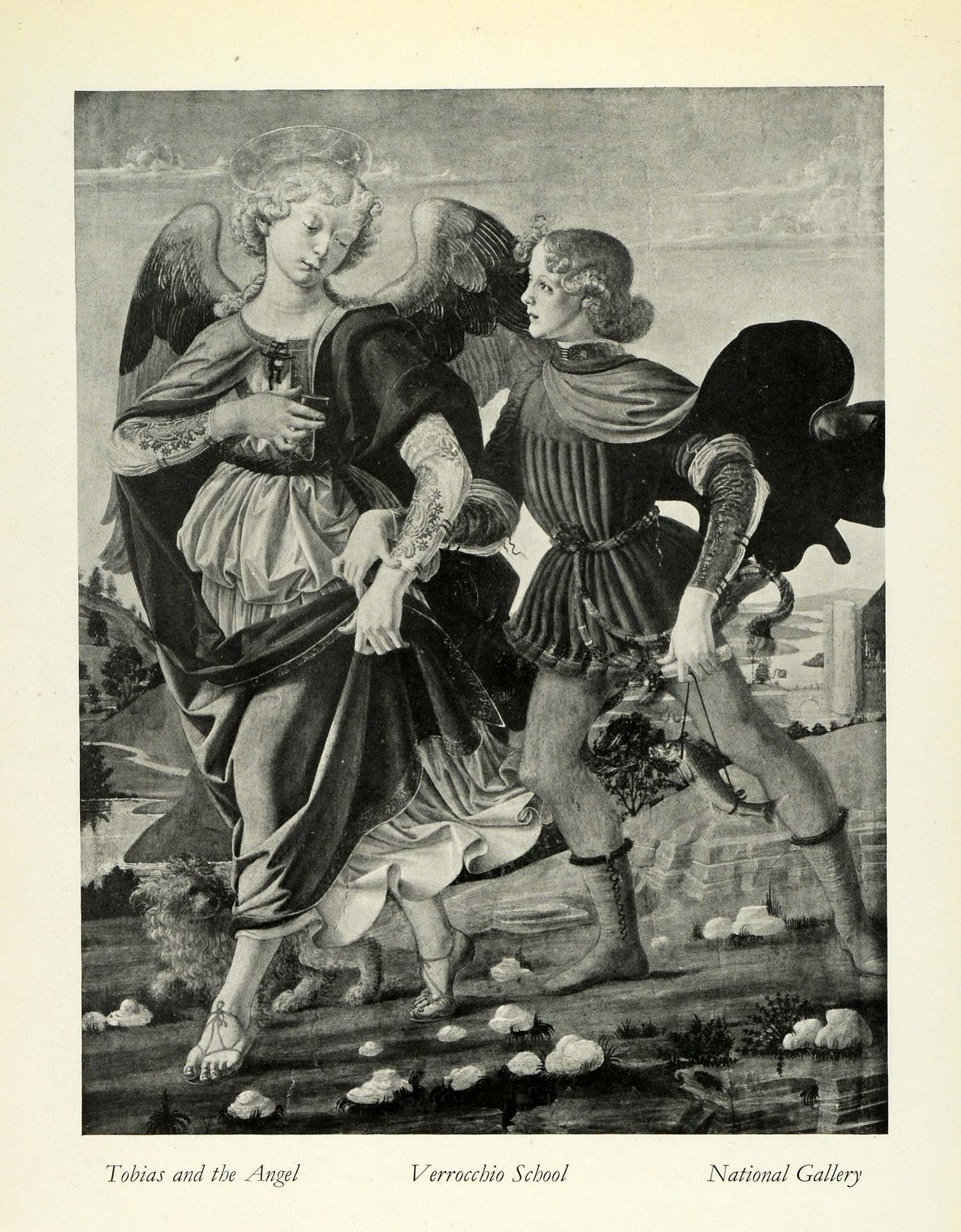 This is an original 1932 halftone print of an altar painting, "Tobias and the Angel," by the workshop of the Italian Renaissance painter, Andrea del Verrocchio.