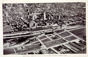 This is an original 1932 black and white halftone print of an aerial view of downtown Toronto, including the central harbor zone.