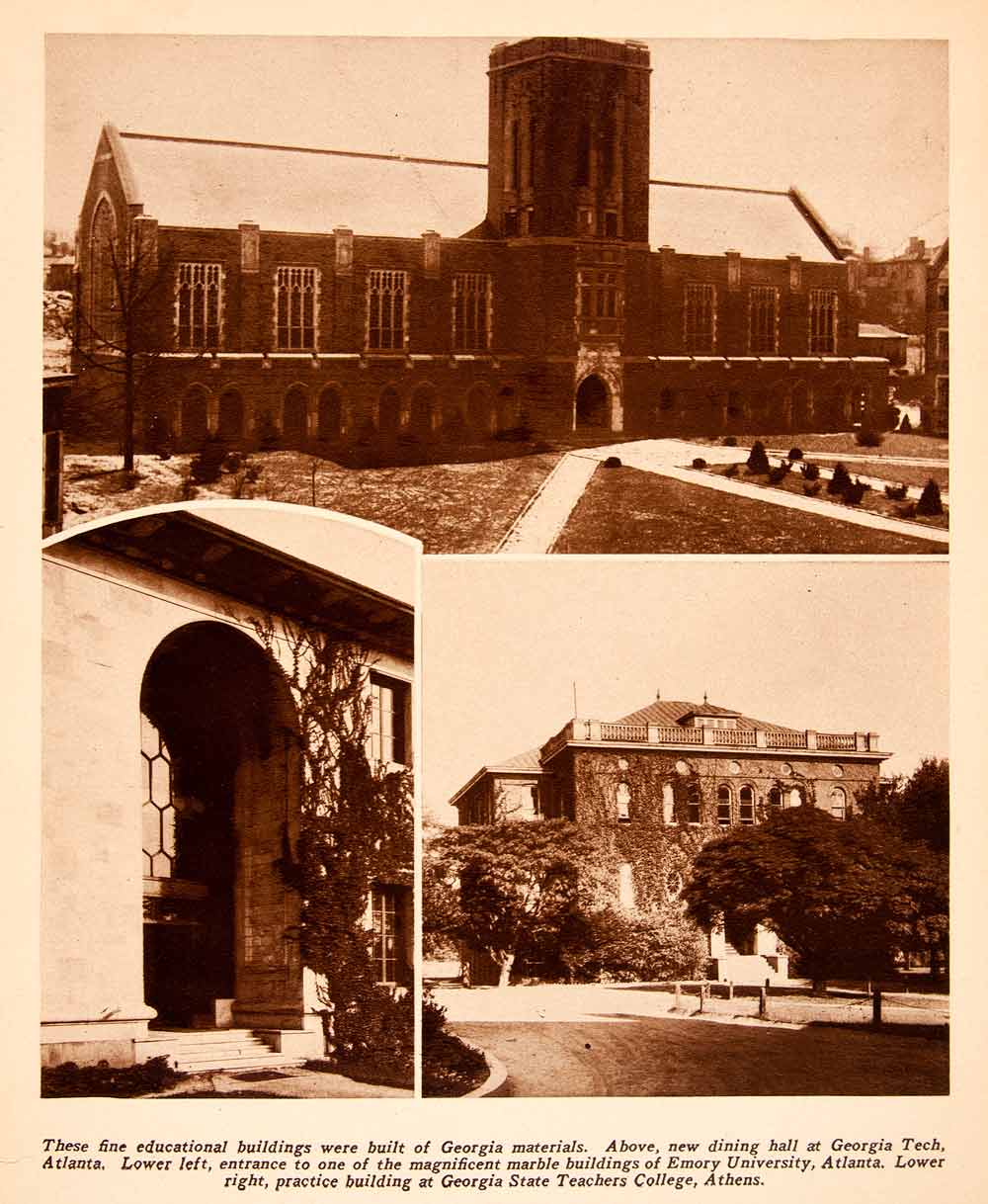 This is an original 1932 black and white rotogravure of buildings from the campuses of Georgia Tech in Atlanta, Emory University in Atlanta, and Georgia State Teachers College in Athens. All three schools are located in the state of Georgia is located in the southeastern United States of America. This state was first established in 1732 and was the last of the original Thirteen Colonies. It was also named after King George II of Great Britain.